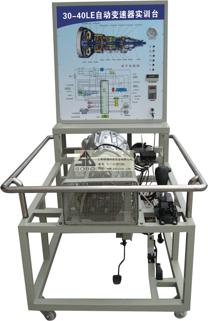 本變速器實訓(xùn)臺是本公司采用豐田后驅(qū)A340E自動變速器為適應(yīng)汽車教學(xué)需求而研制的,該實訓(xùn)臺由電控變速器(八成新)、操作顯示面板及發(fā)動機彩色電氣原理圖電腦控制柜、可移動式臺架(萬向腳輪)、驅(qū)動系統(tǒng)(腳踏式油門踏板)變頻電機驅(qū)動、啟動系統(tǒng)(電門鎖方式啟動)、車速傳感器、電磁閥執(zhí)行器、原車電腦、具有發(fā)動機運轉(zhuǎn)及顯示(轉(zhuǎn)速.車速.檔位)、液壓油壓力顯示表(顯示換檔過程油壓)、自動變速器電磁閥工作指示LED燈、故障設(shè)置區(qū)可設(shè)置12路故障(老師設(shè)置任一路線路故障)、故障排除區(qū)(學(xué)生通過各種儀器、儀表、)在面板上用專用排故線連接排除故障、傳感器信號模擬等多項功能、具結(jié)構(gòu)緊湊、操作方便、安全可靠、教學(xué)直觀、是汽車自動變速器實物教學(xué)不可缺少的實驗室設(shè)備之一。
