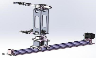 本站的功能是完成向各個工作單元輸送工件,系統(tǒng)分為雙機械手單元和直線位移位置精確控制單元兩部分,系統(tǒng)上電后,先執(zhí)行回原點操作,當(dāng)?shù)竭_原點位置后,若系統(tǒng)啟動,供料站物料臺檢測傳感器檢測到有工件時,機械手整體先提升到位后手爪伸出到位后手爪夾緊,手爪夾緊到位手爪開始縮會機械手整體下將到位后,伺服電機開始工作按設(shè)定好的脈沖量到加工站。加工站到位后機械手整體提升,提升到位后手爪伸出伸出到位后機械手整體下降,下降到位后工件已放入加工站物料臺上,然后手爪松開,松開到位后機械手回縮,等加工站加工完成后再將工件送到裝配站進行大小料裝配,裝配完成后機械手抓取物料送到分揀站進行分揀,這樣雙機械手的一個加工運動過程就完成了。只要料筒不缺料會持續(xù)以上過程。當(dāng)料筒出現(xiàn)缺料后,機器人會搬運過來物料,機械手會運行到取料位置抓取機器人上的小料,然后放入小料筒中,然后返回原點,當(dāng)機器人再次搬運過來物料,機械手會運行到取料位置抓取機器人上的大料,然后放入大料筒中,這樣一個物料的拆分過程就完成了,直到把碼垛料臺上的物料全部拆分完成后為止。