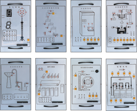 演示裝置上對(duì)PLC的輸入輸出均采用24V電源,5V電源供執(zhí)行機(jī)構(gòu)中的外圍使用,每套演示裝置主要由十七塊實(shí)驗(yàn)掛箱組成,它們的型號(hào)分別為:
