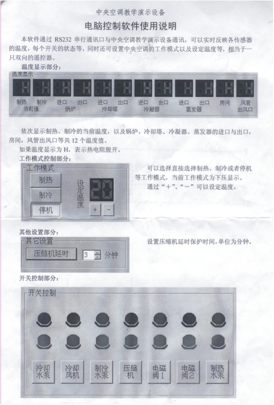 為了更好地滿足各大院校的教學(xué)需要,在原來開發(fā)的中央空調(diào)實(shí)驗(yàn)設(shè)備的基礎(chǔ)上,配備了RS-232串行通訊接口,可直接與電腦連接,由電腦控制軟件控制整個實(shí)驗(yàn)臺的運(yùn)行,包括:總控臺啟動、制冷、制熱、冷卻水泵、冷卻風(fēng)機(jī)、制冷水泵、壓縮機(jī)、電磁閥、制熱水泵做演示,制冷、制熱的溫度設(shè)定等。