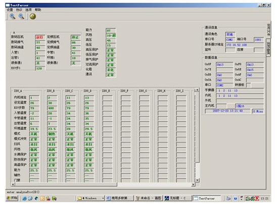 在該文本顯示界面的左側(cè),以文本的形式實(shí)時(shí)顯示當(dāng)前機(jī)組的運(yùn)行數(shù)據(jù)。在界面右側(cè)的上半部分,是對(duì)通訊信息的顯示,包括通訊角色及通訊端口的設(shè)定值以及對(duì)當(dāng)前通訊狀態(tài)的顯示。在界面右側(cè)的下半部分"數(shù)據(jù)信息"中,顯示當(dāng)前接收到哪種數(shù)據(jù)幀、接收到的數(shù)據(jù)幀的地址、當(dāng)前在線的手操器、內(nèi)機(jī)、外機(jī)地址以及當(dāng)前時(shí)間等信息。
