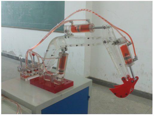 實訓(xùn)臺主要由底柜,透明大臂,透明斗桿,透明挖斗(紅色),透明油缸,透明集成閥島,透明手動換向閥,透明電磁閥,旋缸馬達,減速器等成
